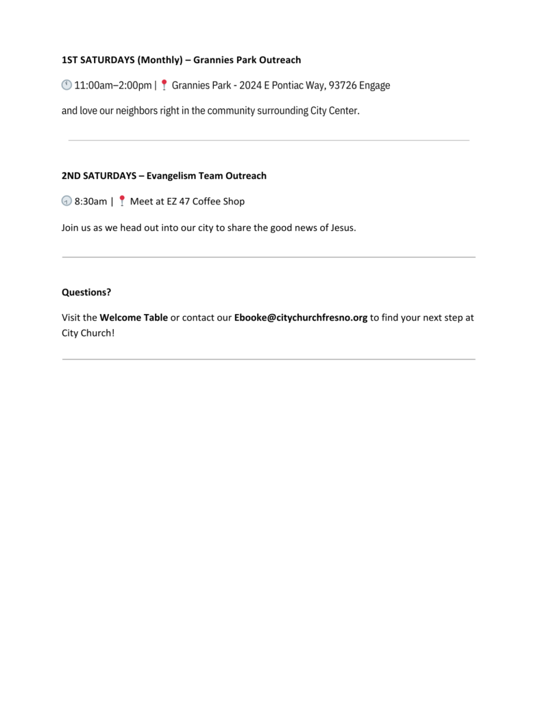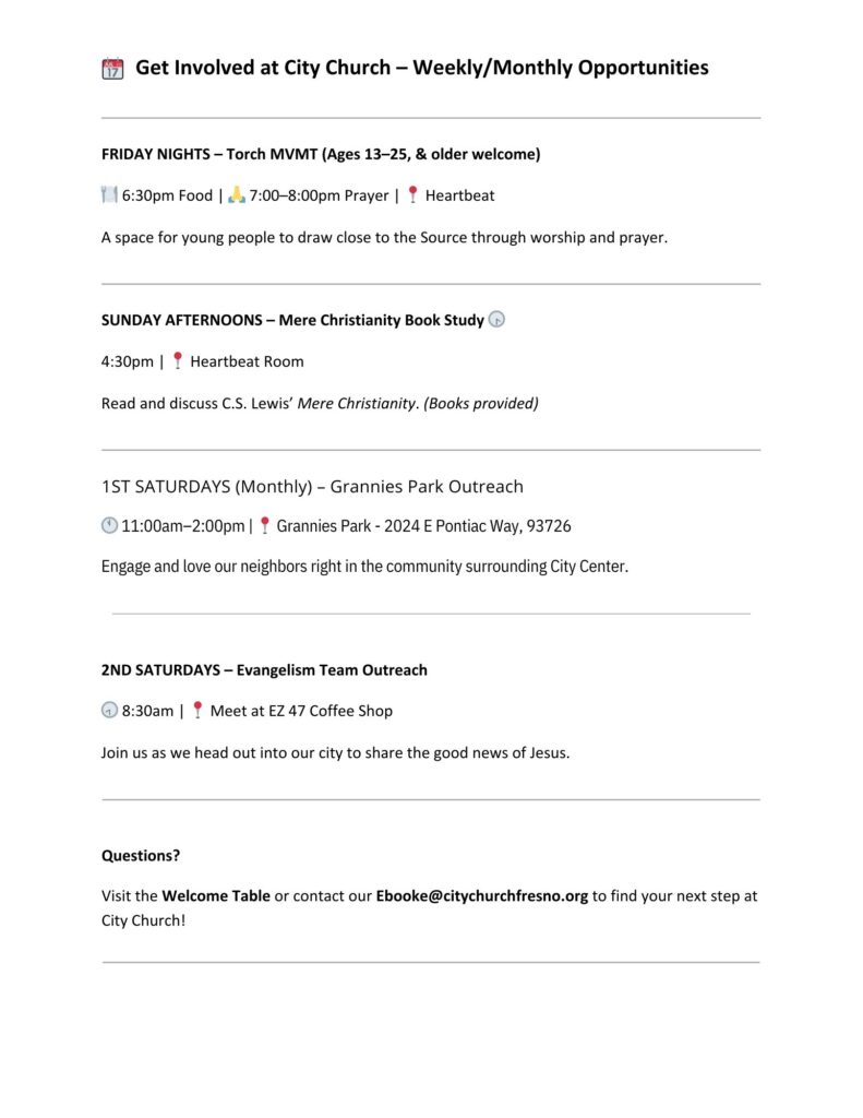 Volunteering with City Church at the Fresno Mission City Center Campus offers you the opportunity to embody the hands and feet of Jesus, making a meaningful difference in the lives of others while being part of a vibrant and compassionate community. As a volunteer, you'll have the chance to contribute your time, talents, and heart to various service projects and outreach initiatives aimed at supporting and uplifting those in need, reflecting the love and compassion of Jesus Christ. Whether you're passionate about serving meals to the homeless, mentoring youth, or participating in community events, there's a place for you to make an impact at City Church. Join us in being the hands and feet of Jesus, spreading His love, hope, and compassion as we work together to make a positive difference in our community.